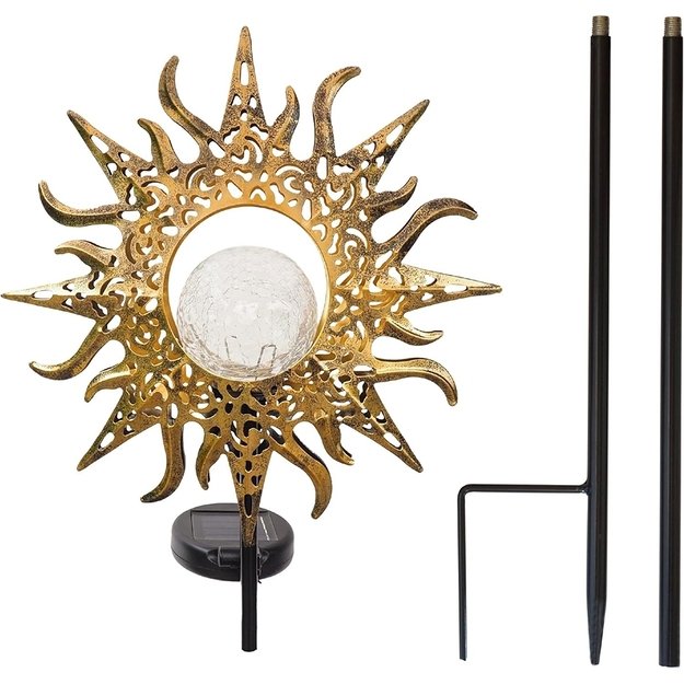 Iš tvirto metalo pagaminti saulės sodo šviestuvai tikrai traukia akį. Išlenkti metaliniai elementai ir stiklinis rutulys viduje suteikia saulės fakelams puikią liepsnos išvaizdą, o metalo raštas sukuria nuostabius šviesos efektus tamsoje.